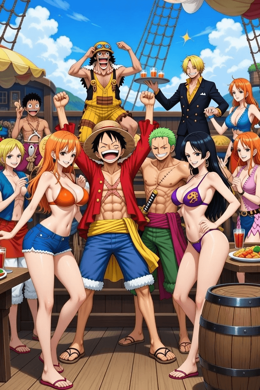 What to expect: The entire female crew (Nami, Robin, Hancock, Yamato, etc.) turned into complete cock-addicted whores. Non-stop gangbangs, bukkake showers, double penetration, ahegao overload. Luffy and the boys (or random pirates) use them like onaholes.